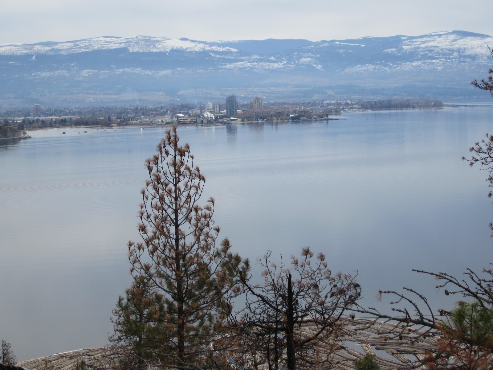 A hill (missing its trees after the fire), above a log-jam on Okanagan Lake.