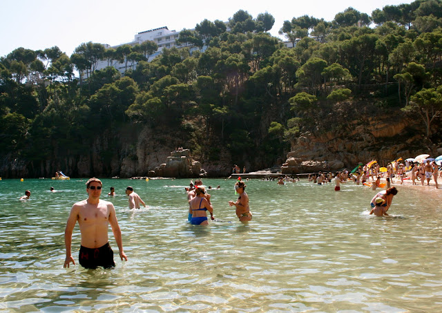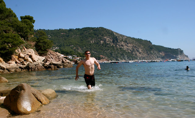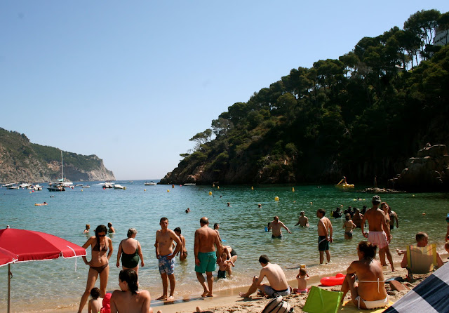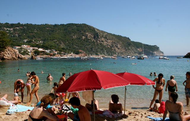 This is another beach near Begur called Aiguablava: calm and beautiful. There was fairly good snorkeling along the right side under the cliff–lots of shells, some sea urchins and fish. The water is cooler than Hawaii so one gets chilled snorkeling for long periods. After staying for many hours we decided to rent a beach umbrella for 7 Euros. No burgers and fries served at the beachside restaurants here. It is always gourmet fair: much seafood, paella, pasta, pizzas and salads. Also there is also always gelatto stands, never ice cream though.