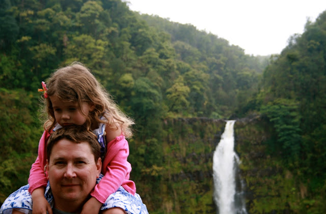 We awoke, drove to Waimea to pick up Mistaya. Then we drove down the opposite coast toward the falls. Akaka Falls is more than a 400 ft drop. We walked on a trail through amazing, thick jungle–vines with tropical flowers wrapping around huge trees. The falls and the walk in to see them were fantastical in their beauty. It was surreal to be in places I’ve only ever dreamed of: thick tropical jungles, with paradise water falls.