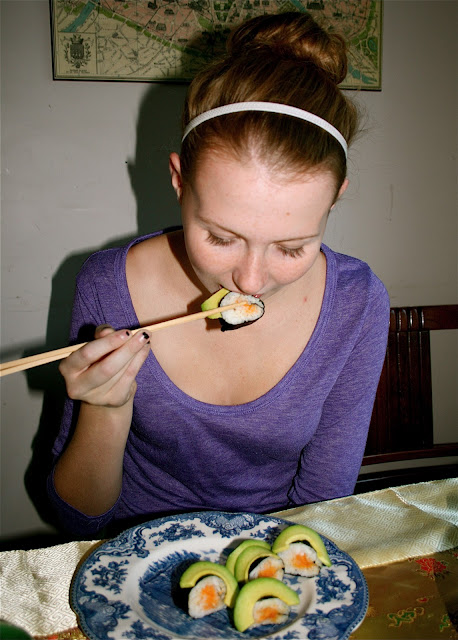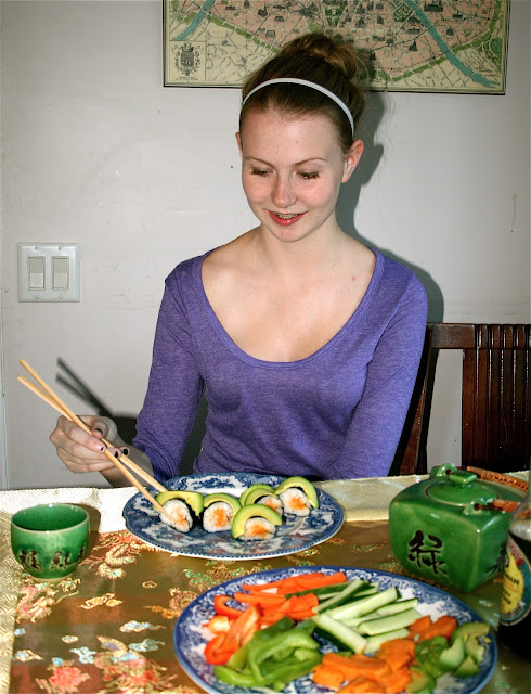 | Mistaya and her favorite shushi rolls (yam and avacado). |