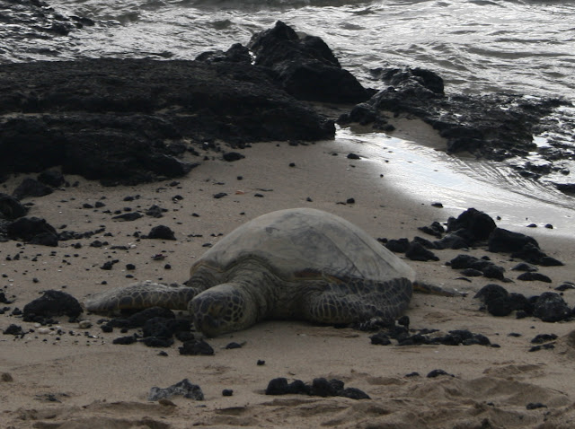 We have arrived at our new condo–very spacious with two bedrooms. We walked and walked last evening until we found this bay, “A-Bay.” The lovely honu was resting on the shore. Today we are heading up the mountain to visit T and family. We are all going to Hilo market, a volcano park and snorkeling in a few natural pools. Hopefully the bush fire is out. Yesterday there was no route up to T’s place as the fire blocked the road.