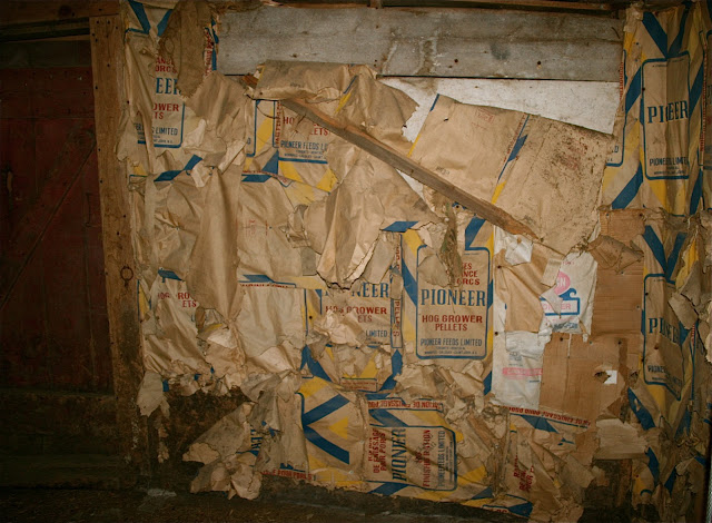| Old pig feed packages insulate the inner walls of the barn. A local mentioned (Winnifred Pibus) meeting a young Alfred and his father Fred at the Brome Fair–the Arthur’s had brought pigs to show. |