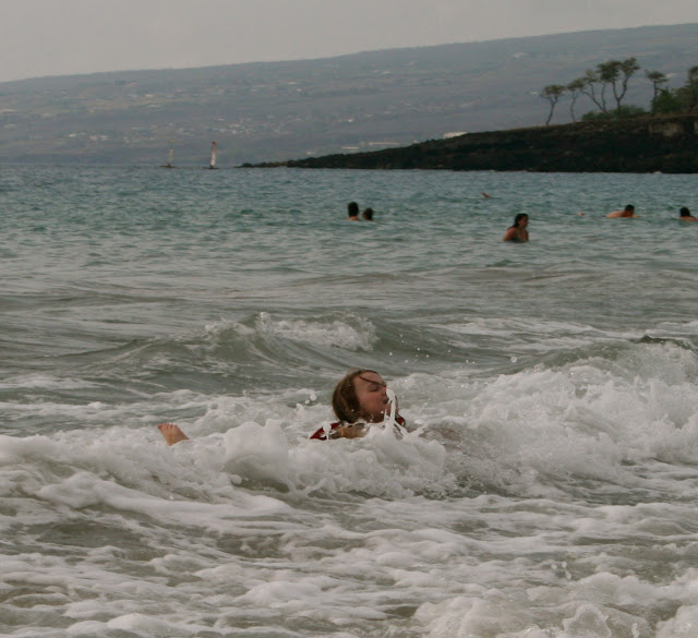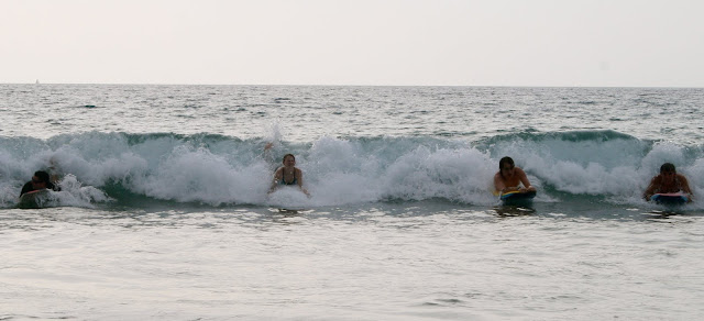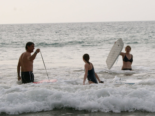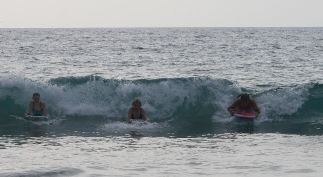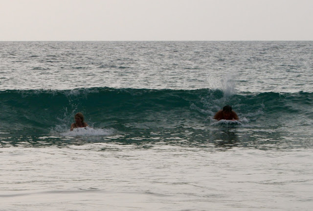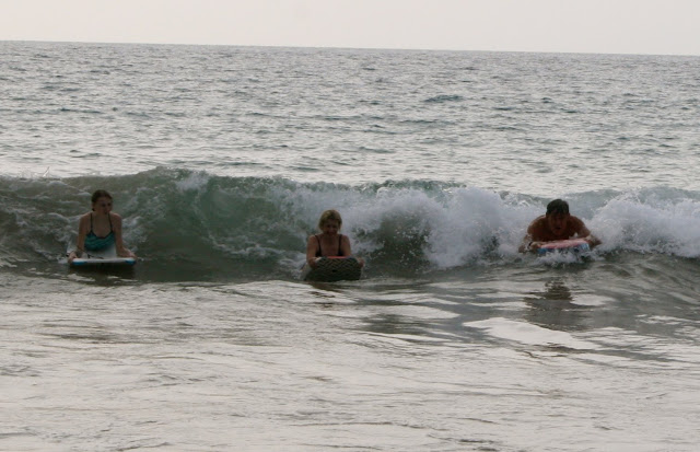Pics of the entire gang at the beach: Tabs body surfing, Theresa and Pip looking glam, Mistaya, Joop, Peter, Kyran and I at various stages of boarding. The South Pacific Ocean is asthetic in every way. It looks beautiful, feels silky and warm on the skin, sounds wonderous, smells fresh, and doesn’t even taste too bad–just salty. Yet still…its power never leaves my pysche for a moment. Every moment of enjoyment coexists with a moment of great thankfulness for the great priviledge to be there, sharing the ocean with so many other wonderous creatures. As well as with a moment of alertness, always noticing any subtle change–have the waves/current changed in size? Direction? Force? Depth? Clarity? Temperature? Are the seacreatures changing in size? Number? Speicies? Everytime I spotted a new amazing sea creature my excitement was tinged with slight fear–what if the next creature is something a little bit too big, with perhaps too many sharp teeth? It is like any sport worth persuing–always a little fear to add to the thrill of it.