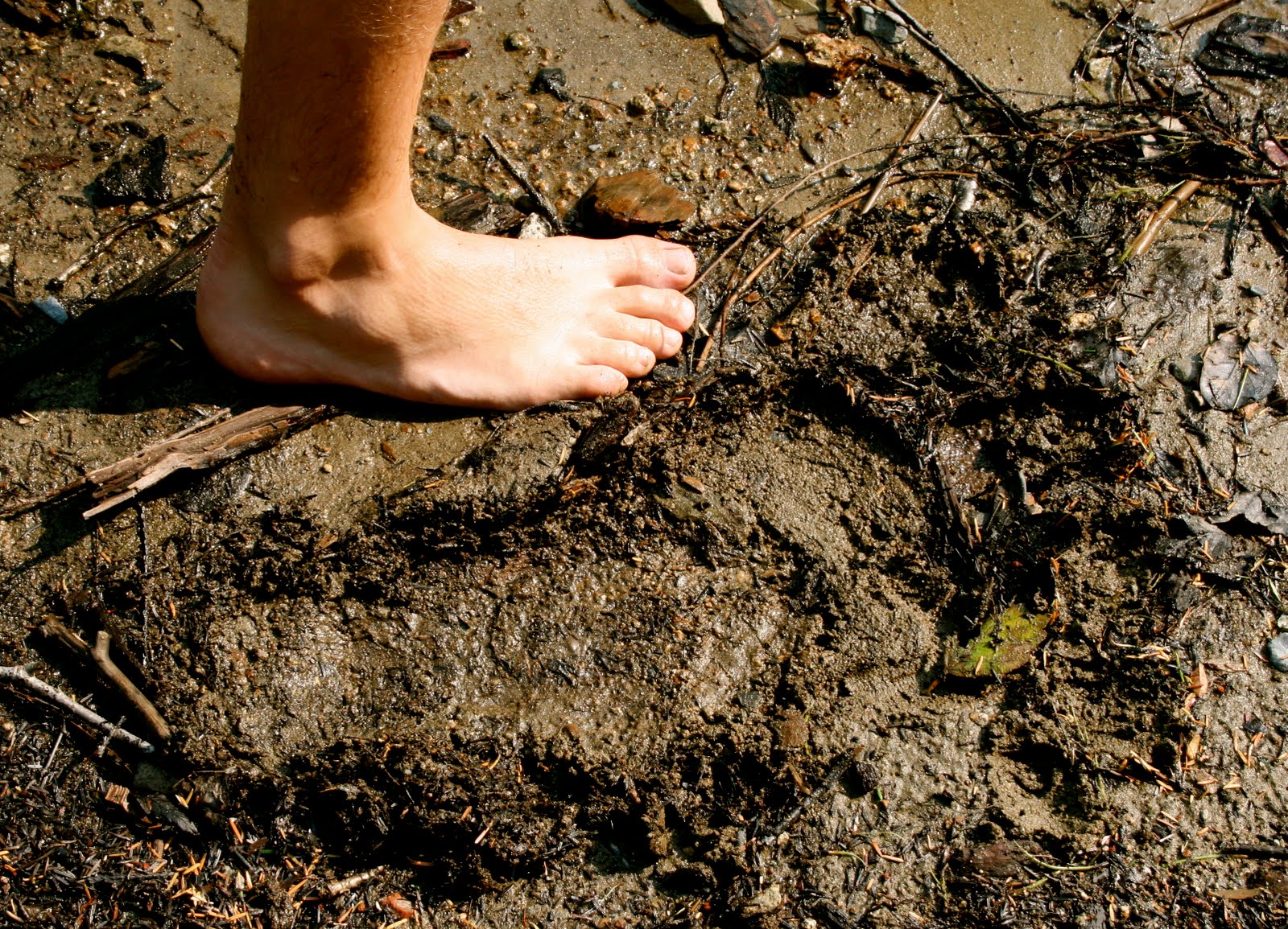 Suspicious foot print we found on the shore of Hicks Lake–Kyran’s foot in comparison.
