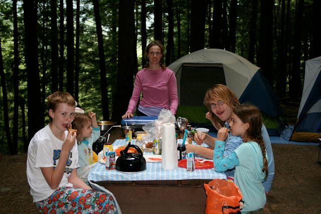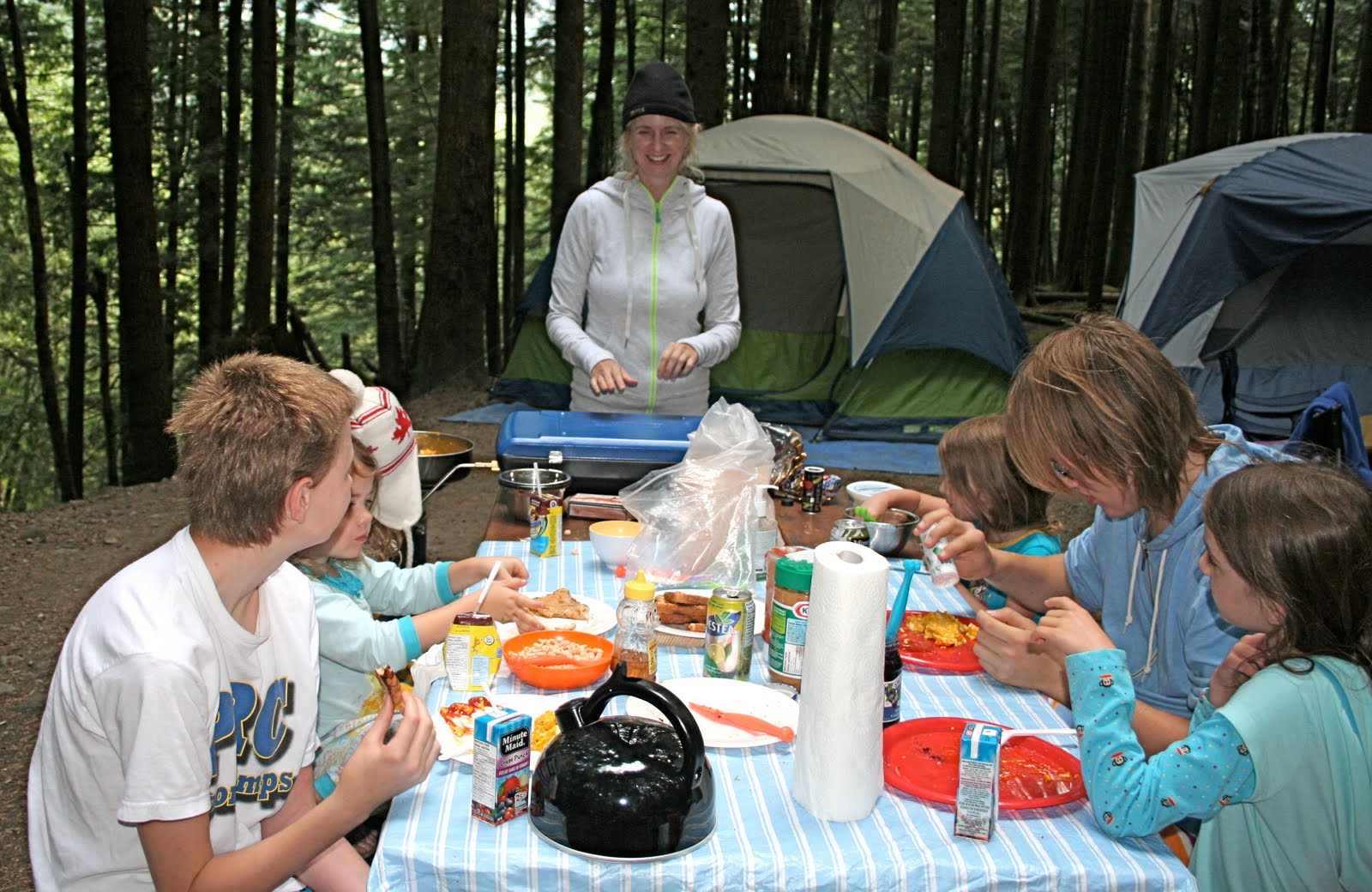 Chef Melissa very pleased that she didn’t have to cook the scrambled eggs! Note the steep ravine behind our tent–very wild and lush with ferns and a bog style creek at the bottom (Mist, Nem and Tabs sunk up to their knees in boggy black mud–I fear the little Pip and Artemis would have disappeared from sight all together if they stepped down from the log bridges!