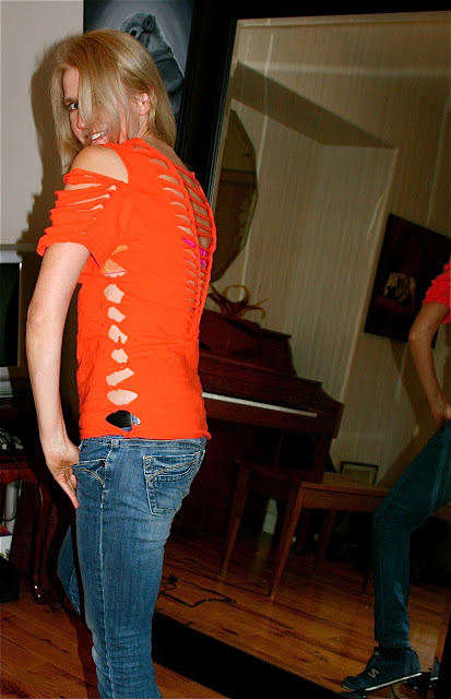 I wanted to try making some cool work-out t-shirts( cool in more way than one). I thought all the cutouts would be refreshing when I teach Zumba. I used an old cheap typical Hawaiian tourist t-shirts I purchased when I was in Hawaii (because I never wear it). I slashed up the front, back, sides and sleeves. It was my first time so I was experimenting with a little weaving too. It was actually fun. I know how to transform all those over sized ugly t-shirts one gets for free at sporting events, into fitted cool t-shirts. I also thought that this would be a great party idea for the girls’ birthdays–each guests could create an unique t-shirt to take home (ages ten and up).