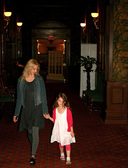 | Pip and I at the Empress Hotel in from escaping another down pour–(rain splashes on my tights!) |