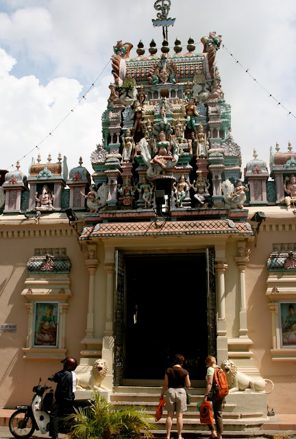 Spent the day touring old Georgetown with new friends Armelle and Janice. Armelle is the partner of Phil ( a colleauge of Peter’s) and Janice the partner of an Australian delegate. They have been great company as we have toured Penang together for two days while our partners conference. Georgetown is fascinating. I especially like “Little India” and Chinatown–seriously untouched for 100 years! It looks like Vancouver China town must have looked 100 years ago. The Old buildings are beautiful and interesting. The blue mansion gets its colour from a local flower :the blue pea–the paint pigment is literally pigment from the flower petals. The Buddhist temple has recently been restored and won a Unesco historical restoration award. Hot and humid–my hair is curly, curly and I love it! SO simple–I never have to style it.