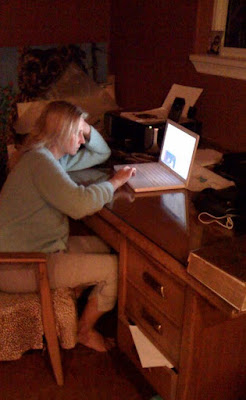 Me in my office/studio, looking anti-glam in my pj’s and ‘ 4 generations of love’ sweater. Peter snuck in and took this pic unbeknownst to me.