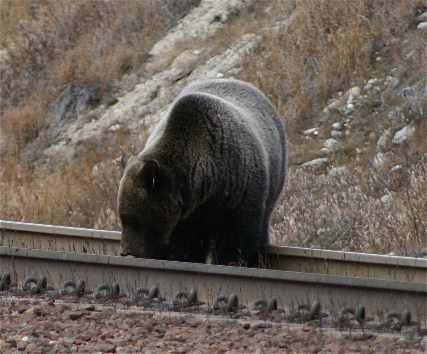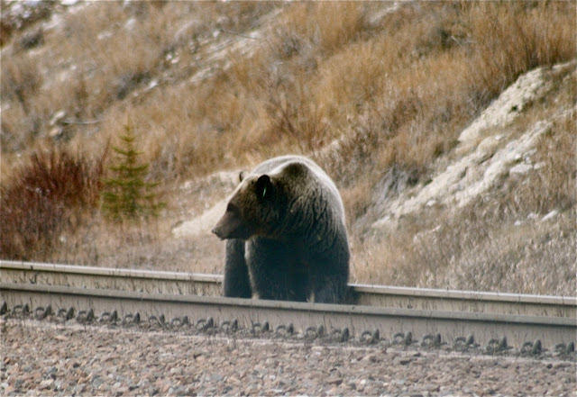 *Update: I recently learned the sad truth about why this grizzly was on the railway tracks. The reason is grain. Railway cars leak grain. The containers are poorly designed and often loose their entire load of grain by the time they reach the coast. The cost of this leakage is death for the bears. A significant number of bears in BC and Alberta loose their lives to trains. The only reason is that they migrate towards the tracks to eat the spilled grain. Don’t you think it is time we designed better grain cars? Is a grizzlies’ life worth nothing to our government? As many train tracks are close to the highway, this also increases the risk of the bears being killed by road vehicles as well. In addition (as in the following case) they provide easy access to hunters when they scavenge for grain so close to open regions populated by humans.