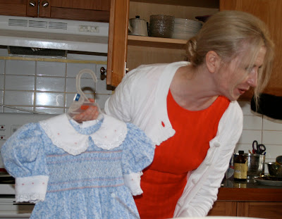 | Me holding the smocked dress my mom made for Pip’s birthday and gave to her on this day |