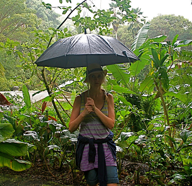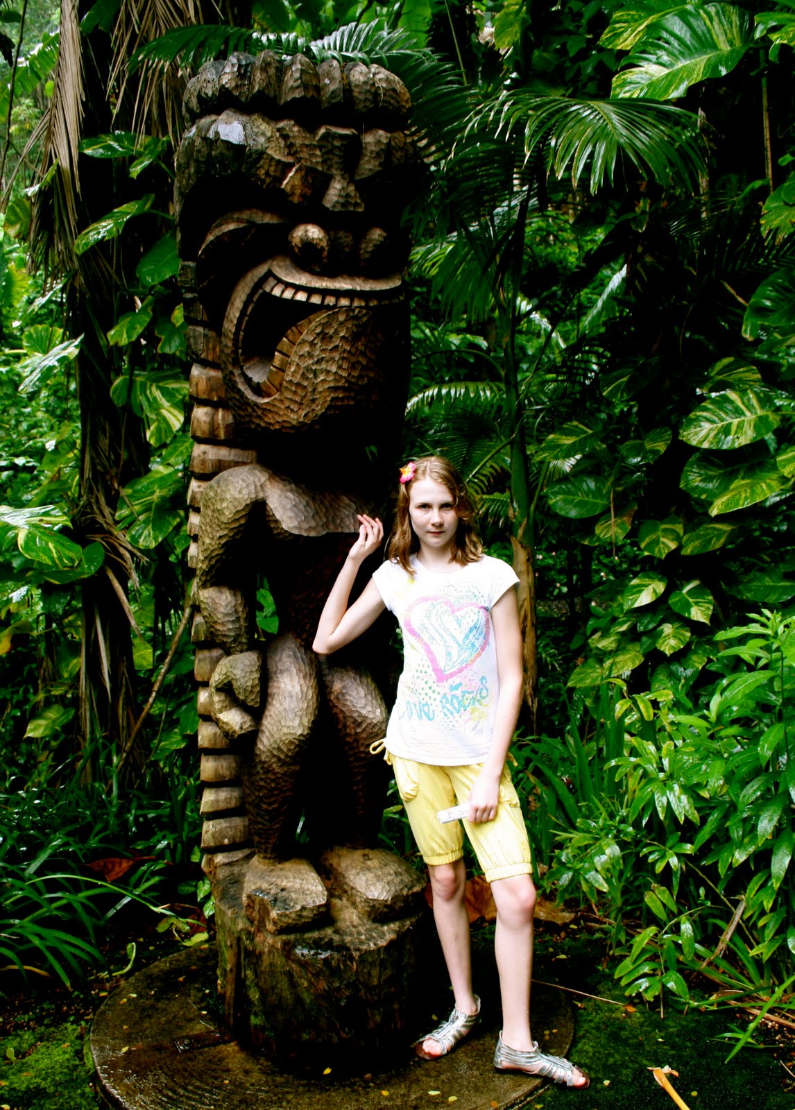 As promised, pics from the botanical garden. Flowers include orchids, a honey comb flower and cocoa pods. The garden is a tropical paradsie complete with warm rain, bird callings, waterfalls and a fierce ocean crashing on the rocky shores. The large lava rock in the ocean picture is said to be two young Hawaiian lovers, who sacrificed themselves to the ocean voluntarily to prevent an impending attack from a rival tribe approaching the shore. It is said that the next morning, the attackers had fled and the young lovers bodies had vanished and in their place was the pointed lava rock–gaurding the shore. Very sad, as so many ancient Hawaiians sacrificed their lives willingly (and often unwillingly) to the Hawiian Gods.