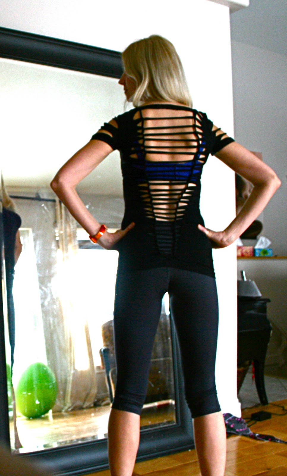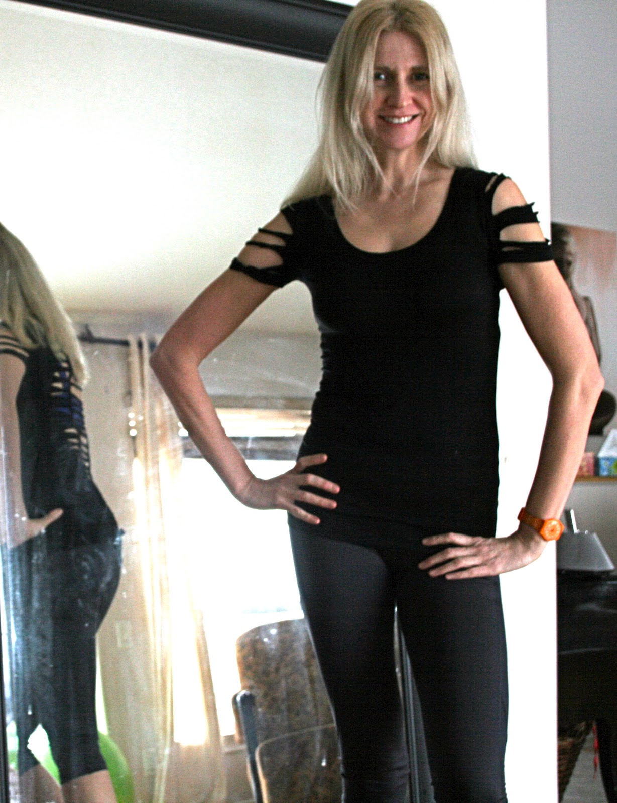 My latest Cut-Up T-Shirt creation. I made it last night. It is my favorite. The secret is to purchase a tight and long t-shirt made of spandex and other artificial fibers. They fit so nicely without getting too saggy like cotton. Just for the record, I have no make-up on in the above pics as they were taken early this morning before working out.