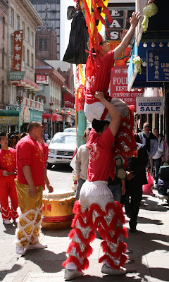 China Town–part of the dragon crew, reaching for some lettuce hanging in the door way? A strange practice I am unfamiliar with.