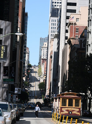 We just returned from an evening trolley ride up from Fisher Man’s Wharf. It was so fun and beautiful in the dark–sandwiched in beside strangers who were all so thrilled to be riding up to Nob Hill together. On the way down to the Wharf, Peter and I were riding on the outside, standing up, holding on for dear life–one foot on and sometimes one foot off. The corners were exhilarating, especially when we passed the trolleys coming up. We met an interesting German family visiting from Aachen. They had to boys aged 11 and 14. They are staying at the Fairmont too. We had a very nice chat waiting for the trolley and riding up.