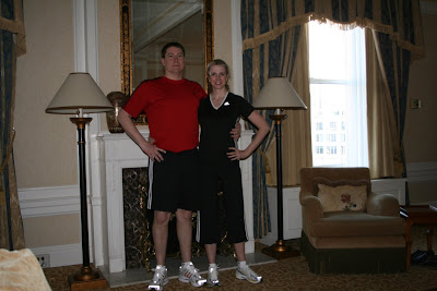 Peter and I in our suite, dressed in our complimentary gym attire (including shoes). Ready for the gym, which turned out to be a trip to the Twilight Zone. My fellow athletes this morning at the Fairmont gym, seemed a little unusual. Like the woman beside me, whose face was set in an open mouthed grimace (with hands, up near her face, in a rigid pose) who cleared her throat every 3o seconds and kept the pose throughout the entire time she peddled the bike–and no, she was not partially paralyzed, as she eventually got off the bike and resumed a normal posture. And the woman behind me, trying to “stair climb” at a level way too difficult for her. So she took inch-deep steps and rocked her entire body and head, wildly, from side to side with each step. An interesting day at the gym to be sure! However, I am looking forward to yoga and spin classes each early morning while I’m here.
