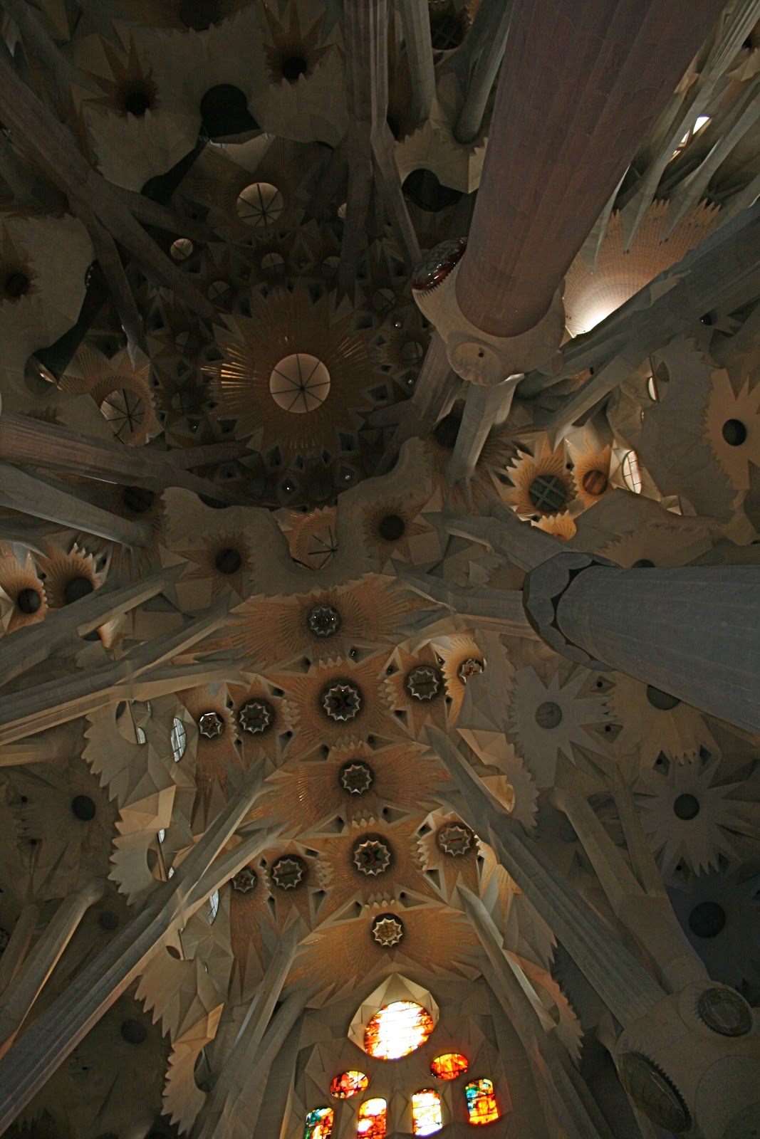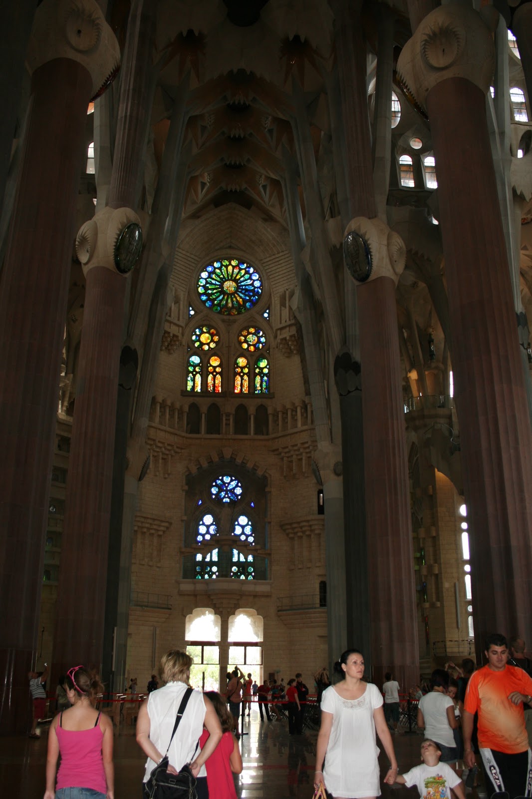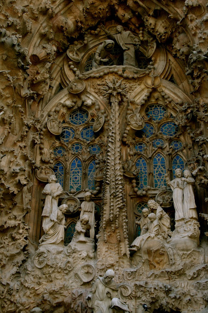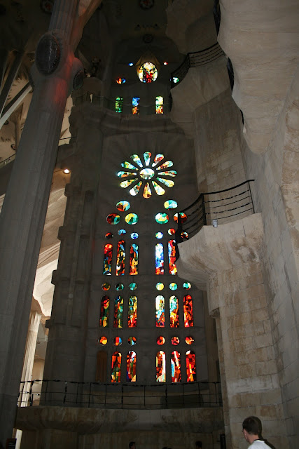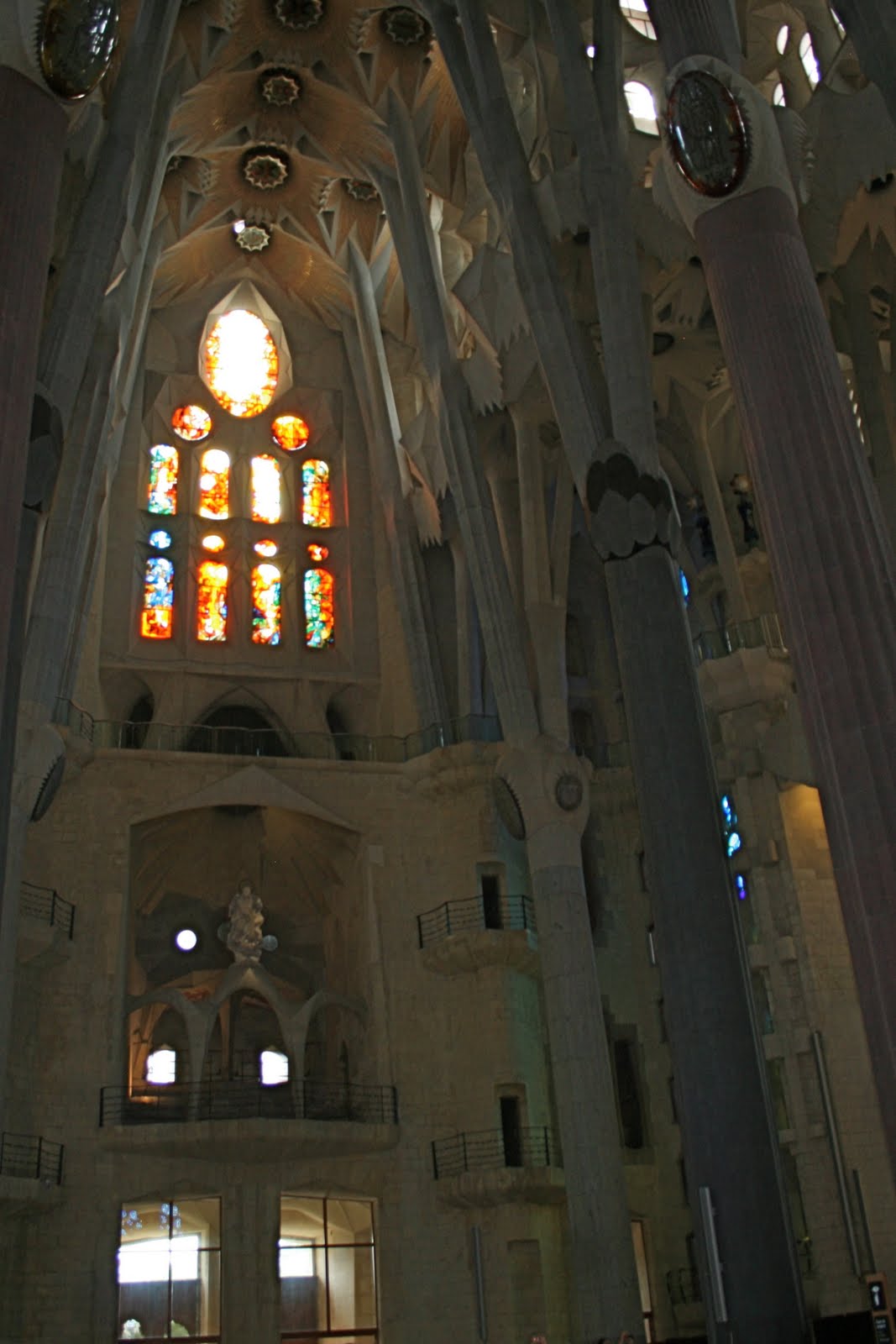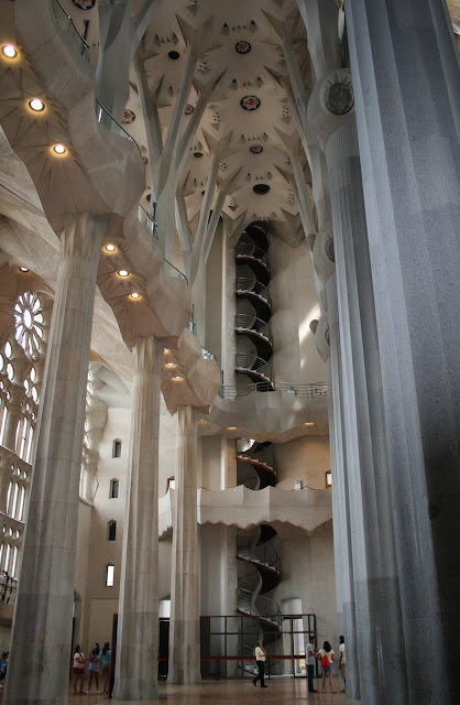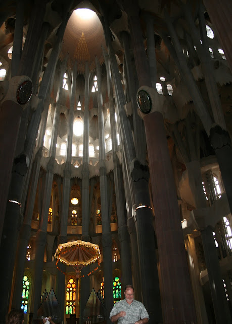 The below photos are from our personal tour of La Sagrada Familia–another Antoni Gaudi masterpiece. Note also the tower staircase: at one point the interior wall disappeared and a 2 foot high, rounded stone railing took its place. One could see straight down the stairs to the church floor below. It was terrifying. I could only descend the narrow staircase by holding onto the exterior wall and looking no farther ahead than the step directly beneath me. My hands were so sweaty from fear, I was afraid I’d loose my grip, get vertigo and tumble to my death! I kept asking Peter, “Are we getting close to the bottom yet?” He always reassured me. I have been in those tense situations a few times before, when one knows that despite sheer terror, there is no turning back and one must creep forward as the stairs were the only way down (giving birth and walking the suspension bridges above the Taman Negera jungle in Malaysia come to mind).