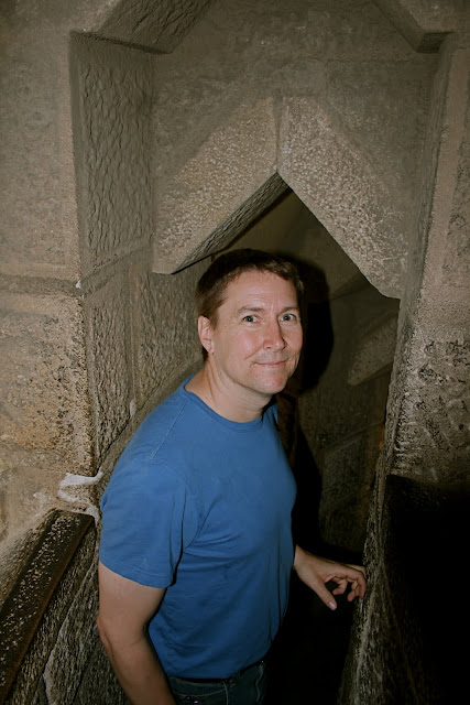 | Me, waiting for our lift time to ascend the tower (one must catch a lift up and walk down the narrow stone stairs)–they will not allow one to climb up nor ride down. |