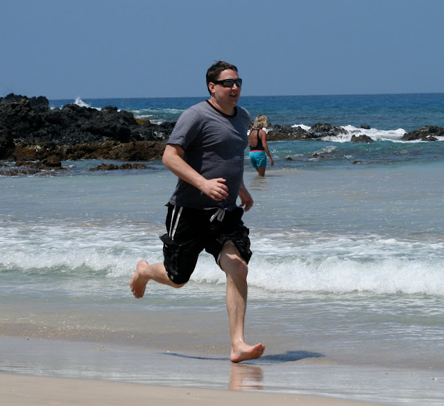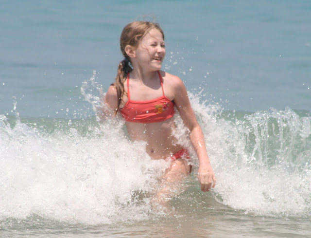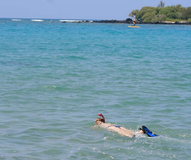 We spent yesterday at the beaches of Mauna Kea and Anaehi’omalu. We snorkeled both places and played in the waves–body surfing. The coral was big and beautifully coloured: green, orange and purple. It was very wavy and the ocean unpredictable at Mauna Kea so they wouldn’t rent boogie boards out. The snorkeling was a little murky as the waves stirred up the sand. I didn’t know until Theresa told me later (at supper) that sharks prefer the sandy, stirred up water. When PJ and I beach it alone with the little girls, we have to snorkel alone. So that precludes going too far out. Saw a lovely honu (sea turtle)again. She was right at the beach in very shallow water, lifting her cute head up to take breaths and look around at us. We met Theresa and crew at Tommy Bahamas for “Island Hour” supper of appies. The Mist came home with us for a one night sleepover as Tabs has been missing her terribly.