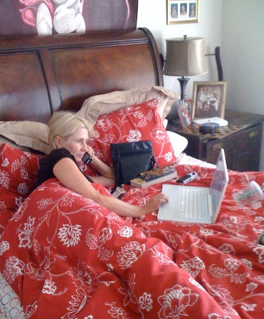 Peter secretly took this pic of me the other day on his iphone and mailed it to me. I was only in bed to be comfy–as you can see I was fully dressed in a brown dress. I think I was making an imovie at the time.