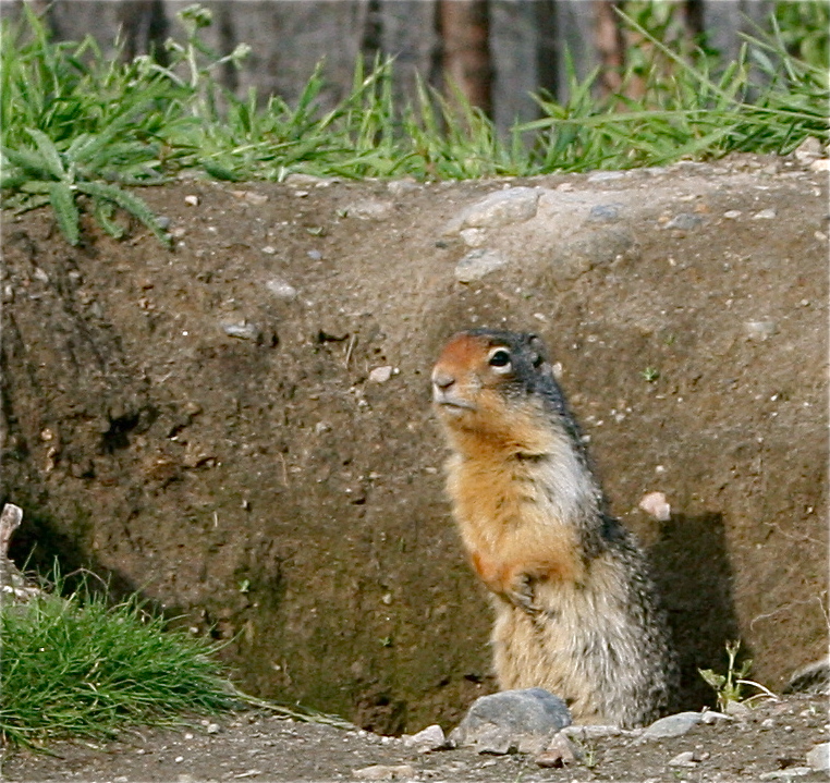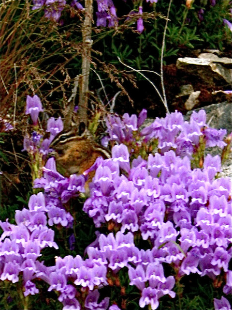 | This little chipmunk had it all. I discovered it early in the morning, nestled on a rock face in a cluster of gorgeous flowers, munching away on its breakfast. |
