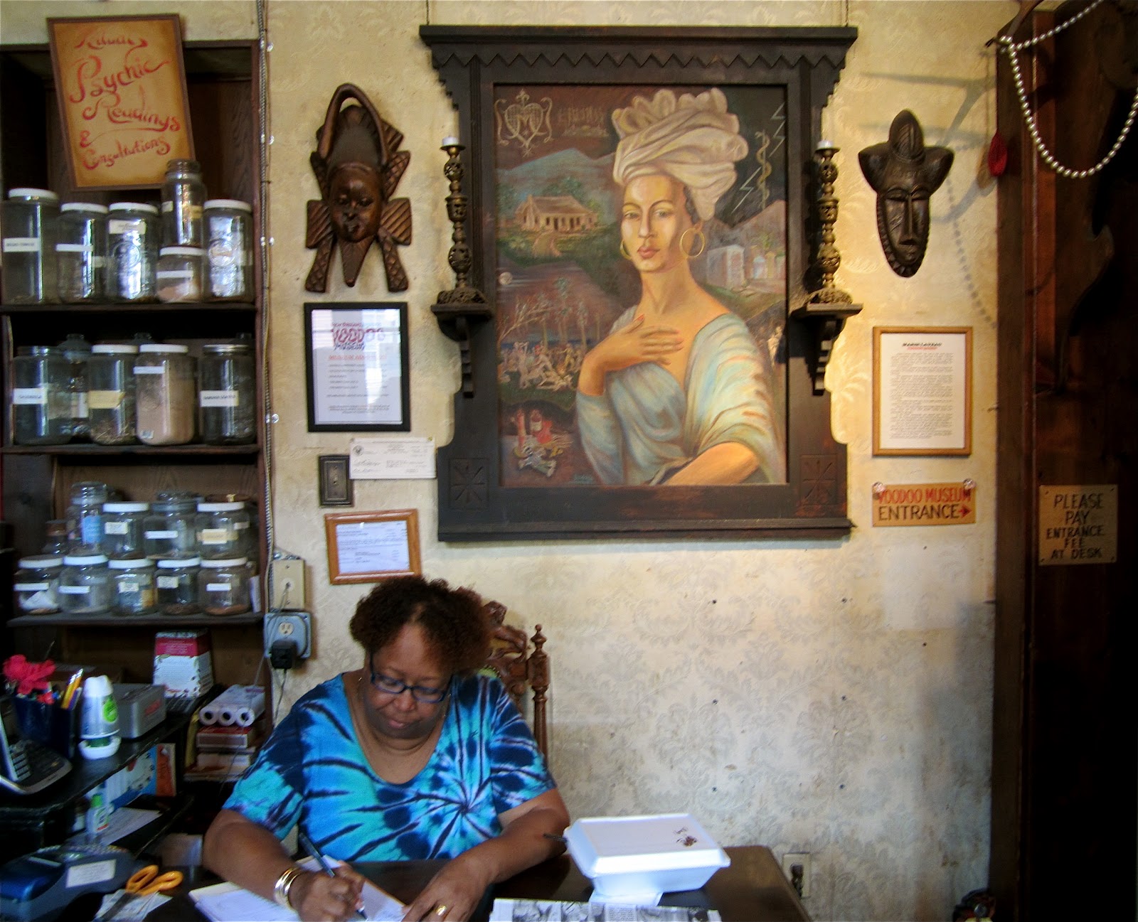 The portrait on the wall is of the famous New Orleans Voodoo Queen Marie Laveau (born in 1801) She was known as a healer and specialized in love potions.