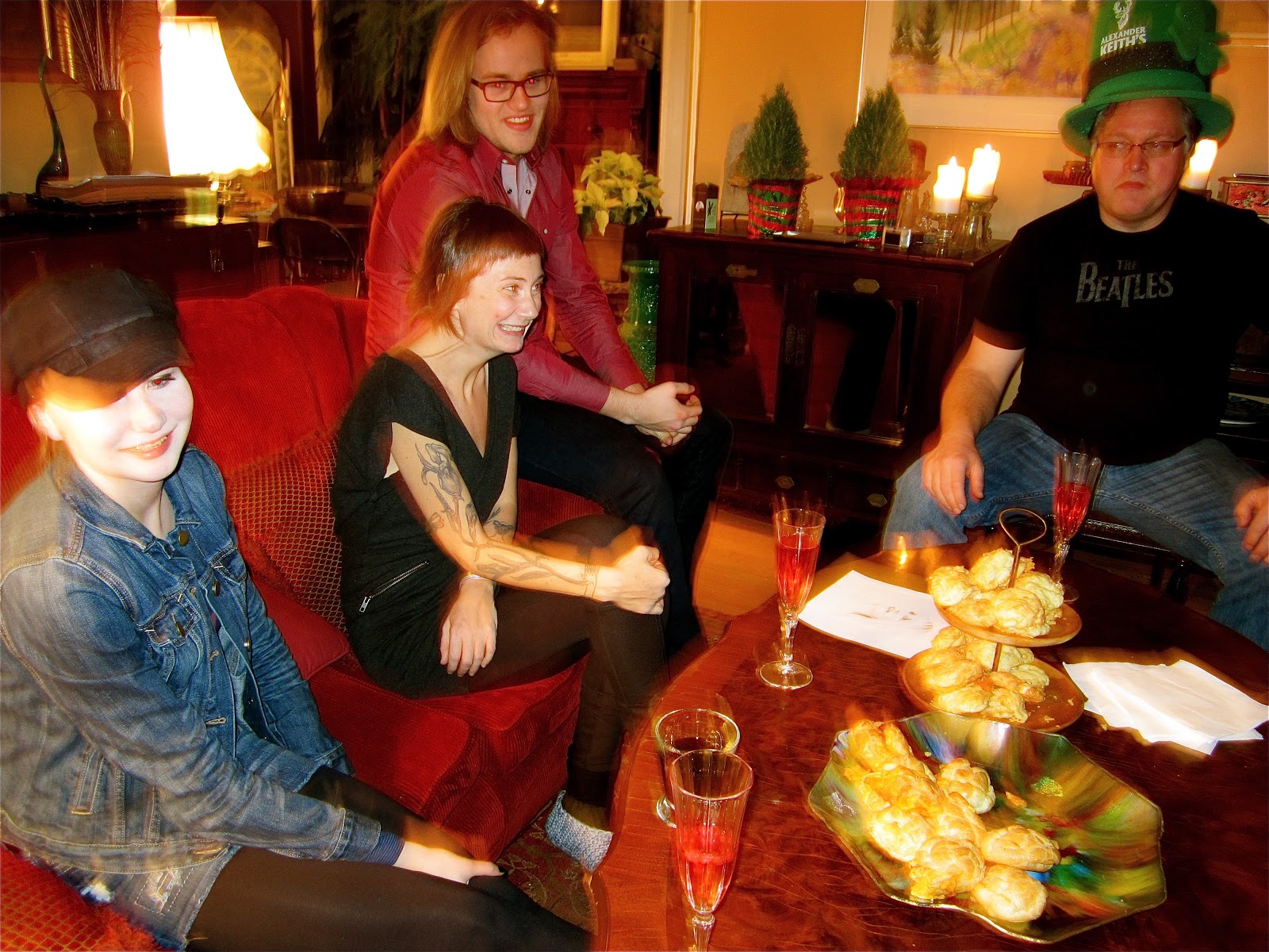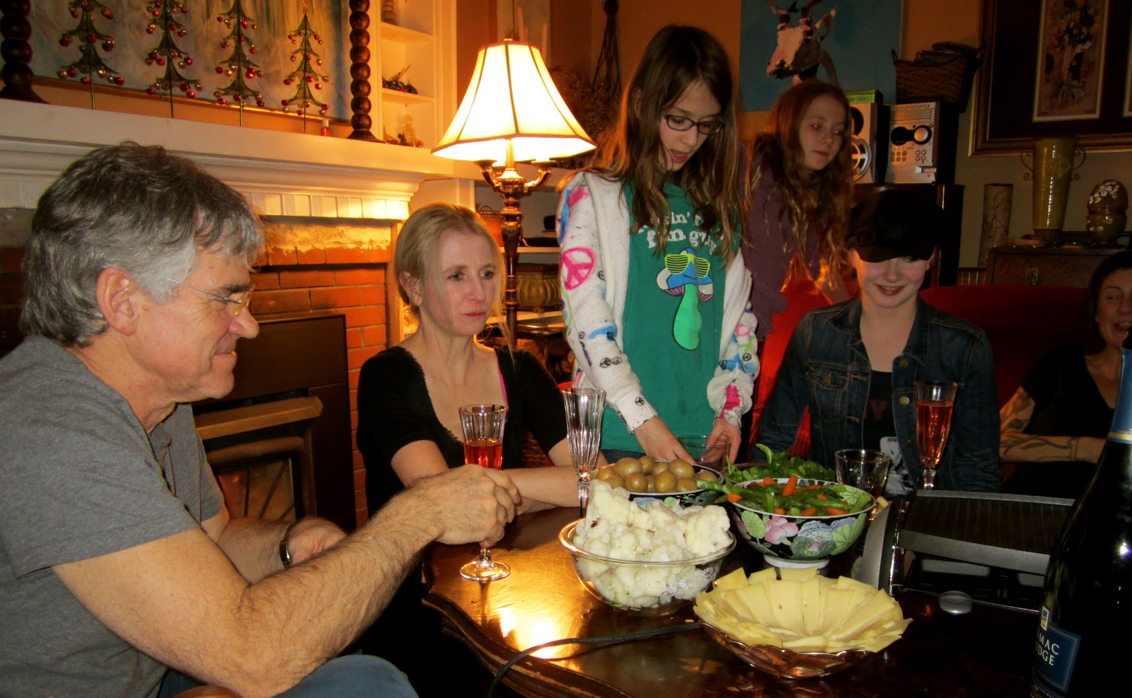 We drove back to Nelson where my sister Theresa was busy preparing an amazing Swiss roclette. A roclette requires a roclette grill (above). One melts slices of soft roclette cheese and then scrapes the melted cheese onto steamed veggies. Very yummy. Theresa also served shrimp buchettes (my mom’s famous recipe) and other delicacies. It was very cozy and enjoyable. I was not dressed in my usual fancy attire for New Year’s Eve as the roclette was to be followed by a dance party down the mountain at Hart Hall (the historical building my sister just purchased down town. She is remodeling the main floor to house her vet clinic).