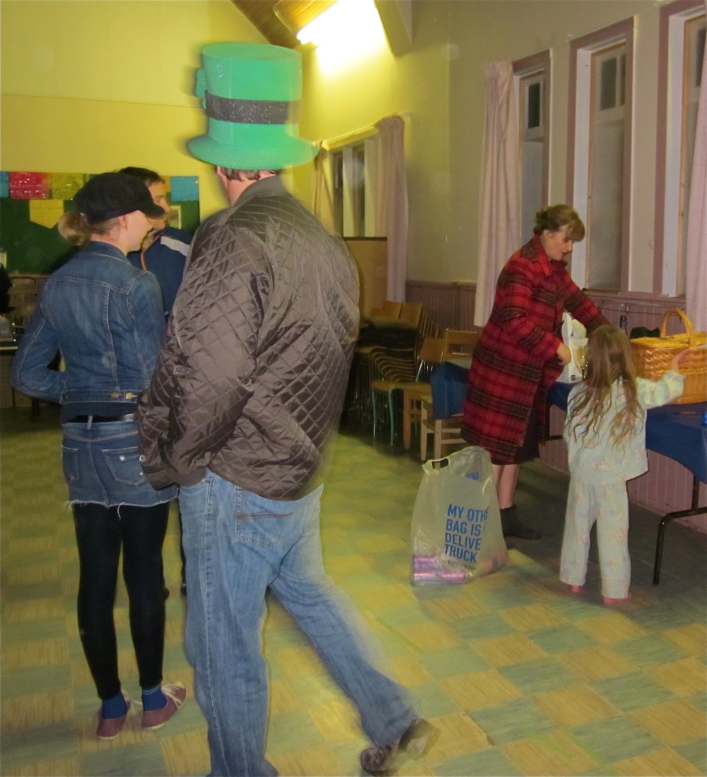 Had to post our party pics from New Year’s Eve. I just love my sister’s new building. Hart Hall is the best: a giant hall with a cathedral ceiling to run and dance to our hearts desires. Theresa just purchased the historical stone building from the Anglican Church on Nelson–so there are many repairs and renovations to do–under the tile (in the below pics) is oak hardwood. The main floor of Hart Hall will be used for her Vet clinic–Theresa is a vet. My sis’ partner Joop was at the party too but unfortunately when I had the camera out, he was back at the house finding us a sound system.