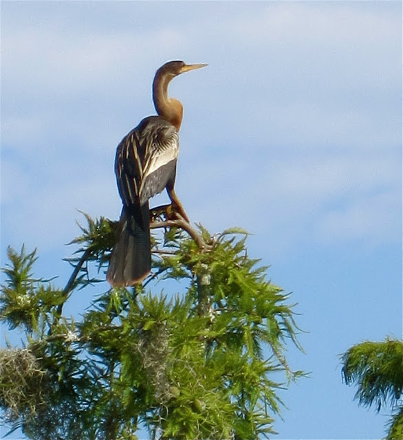 | The prehistoric-like bird (Anhinga) sunning its feathers as it has no oil on its feathers so it must dry them out between dives. |