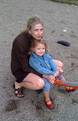 Pippi and I at the park last night watching Mist and Tabs practice biking around the ball diamond. Misty was the teacher, Tabs the student. The deal was that if Misty was a good teacher, and Tabs got an “A” for biking, then afterward we stopped for slurpies. It worked like a charm. Mist the enthusiastic teacher and Tabs the diligent student. No more agony for me as I attempt to get Tabs biking skills up and her complaining bitterly.