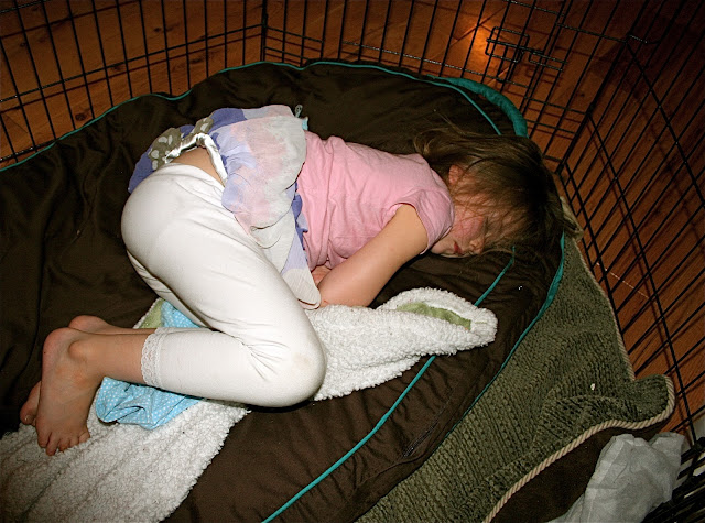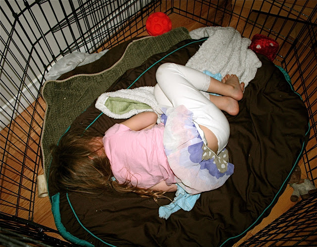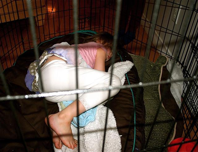 I arrived home from teaching dance at 6:30 pm (yes my lungs held out for the entire class, YAY!) and this is what I found: Pippi sound asleep in the locked dogs’ kennel. Tabs was babysitting. I asked Tabs, “How long has she been in there?”