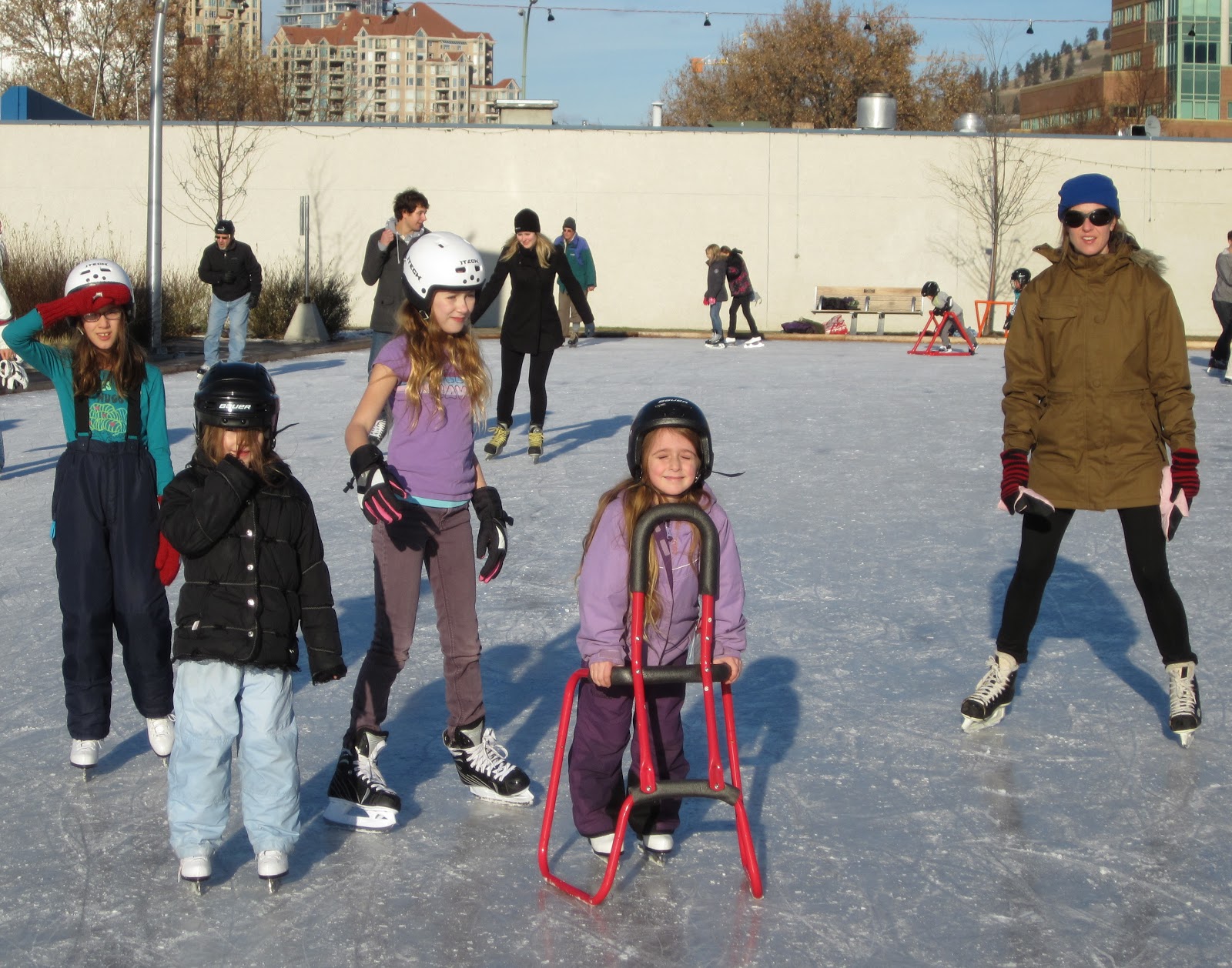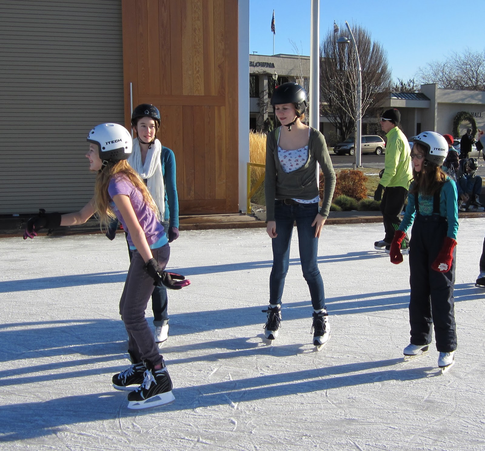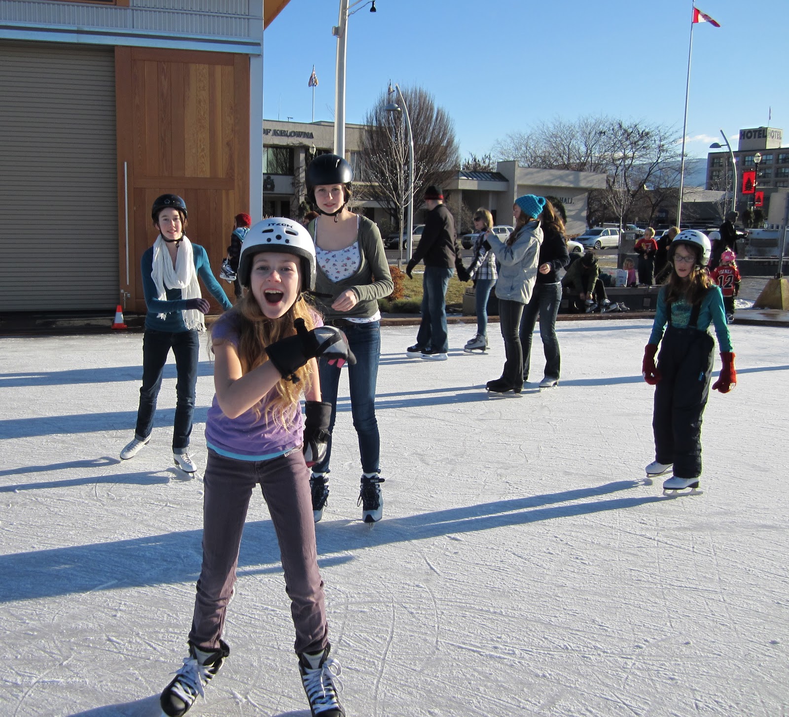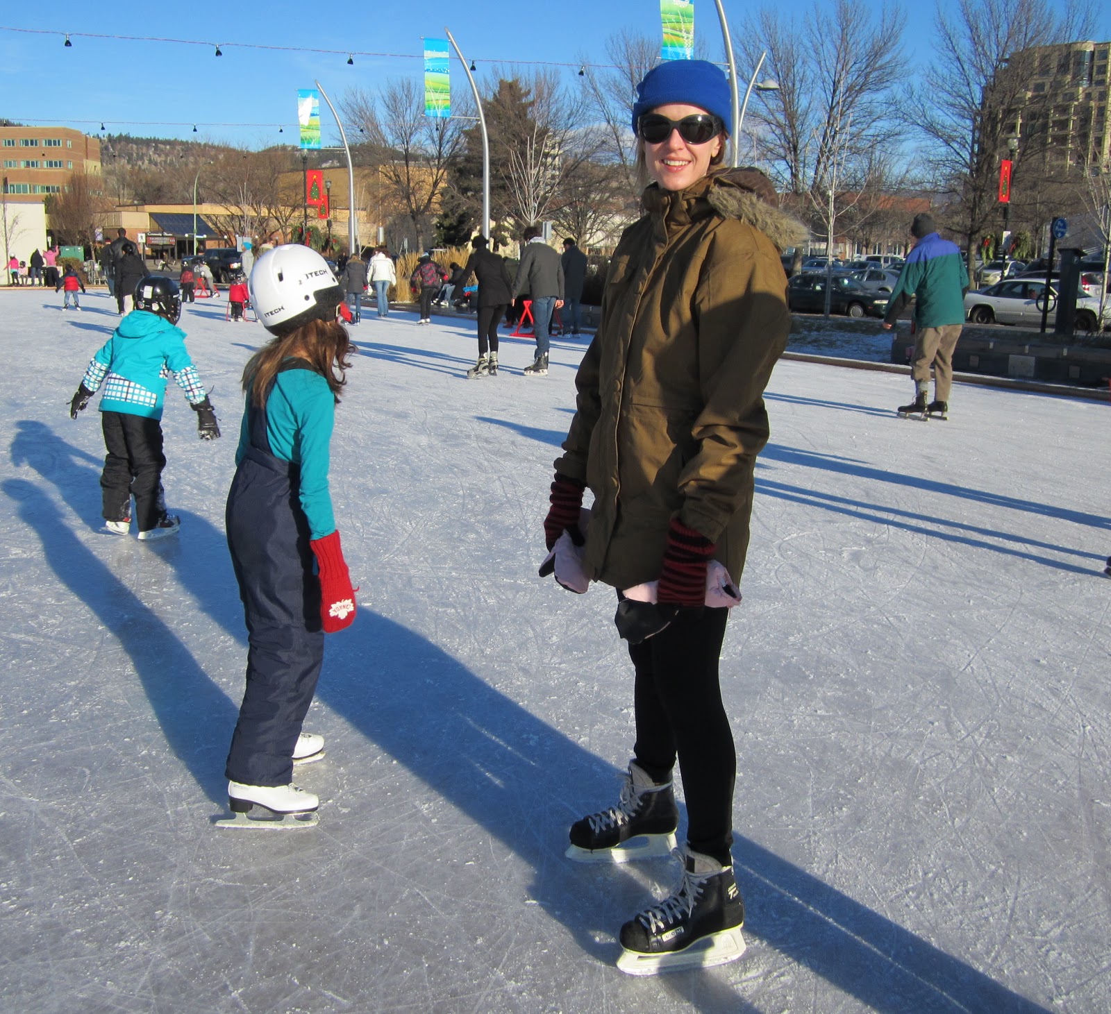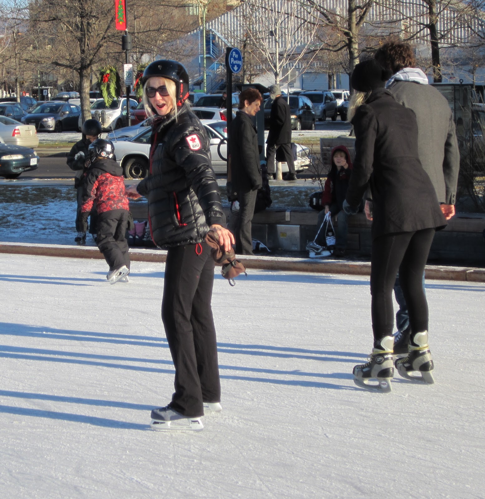 Had fun on my first skate of the season. We were down town at the lake front rink. Such a sunshiny warm December day. I always have land legs for the first while until my ice legs adjust. One little tip: never wear a too small helmet and chew gum at the same time–brutal headache. Tabs borrowed my helmet and left me with hers. After my brutal experience I switched to Miranda’s helmet (pictured above).
