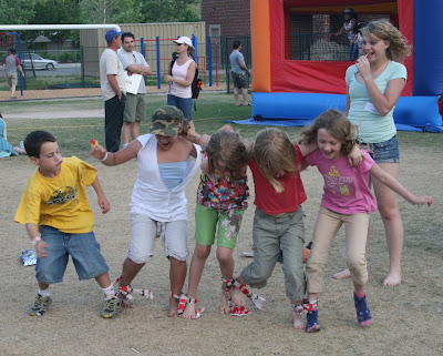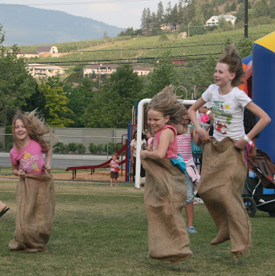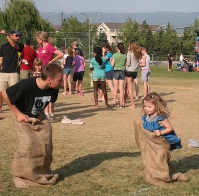 Pip’s first sack race–she’s getting encouragement from the volunteer. Man, was she cute!