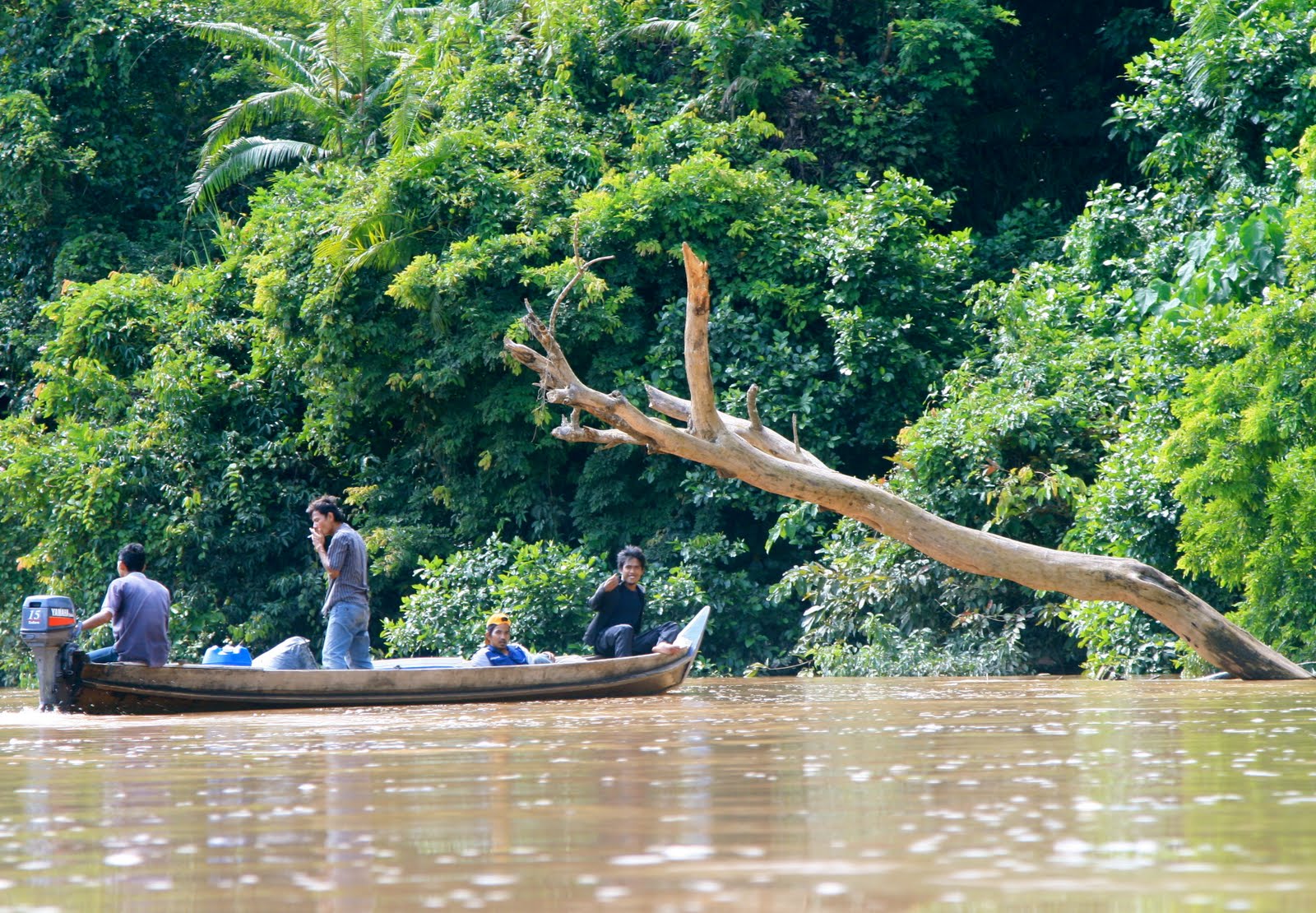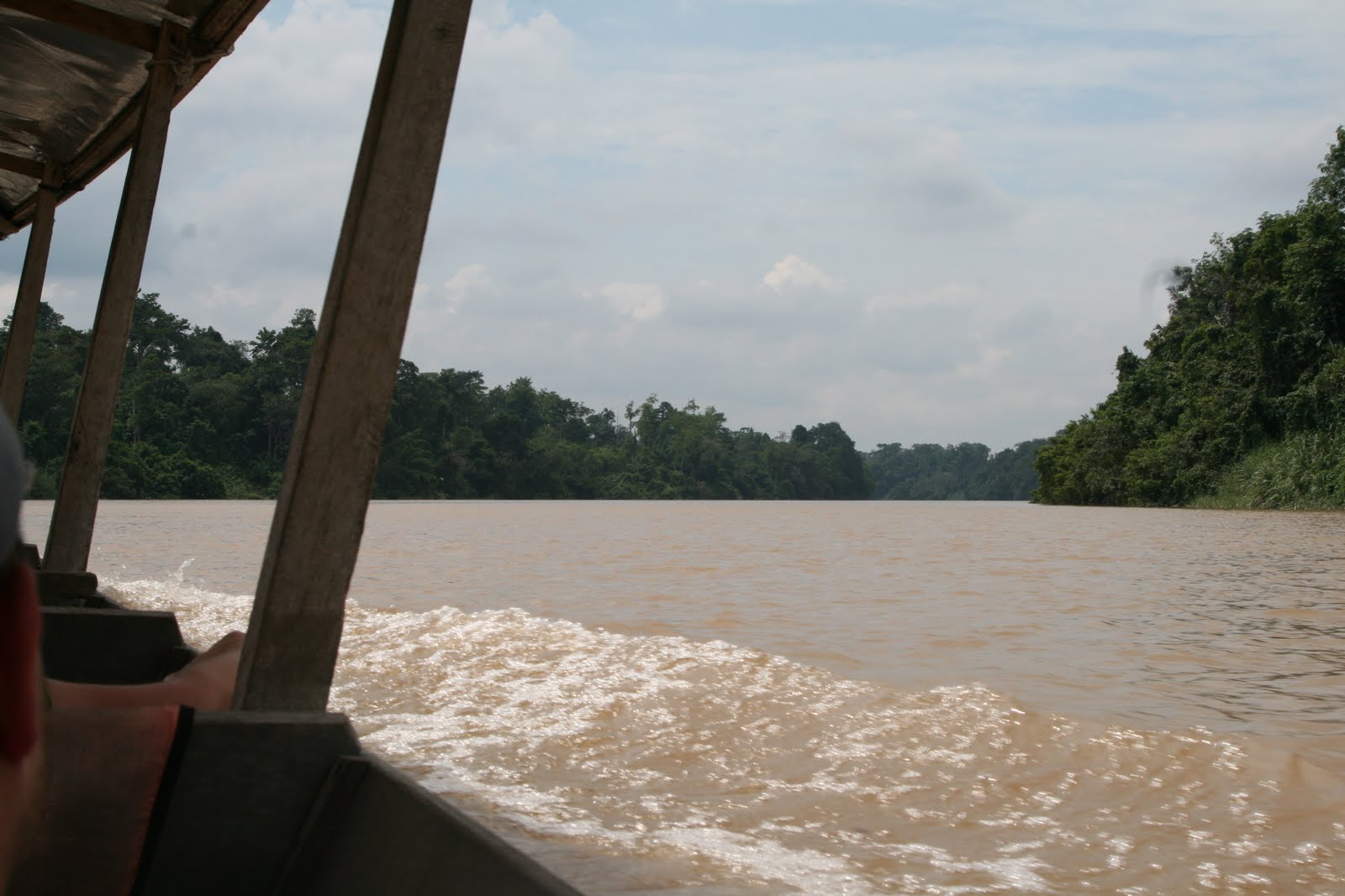The boat arrived. A long, wooden rickety Malay style canoe with a tin roof and an old motor on the back. It seated about 12 people. And then there is the river. The RIVER! A huge, wide, jungle river–fast flowing, deep and brown in colour. The Tembeling. It was terrifying stepping onto the boat–no life jackets expect ancient, moldy ones if you chose to brave putting one on. Even entering the boat proved death defying–the wooden steps of the jetty were rotted away in places and one false step you fall into the deep river.
