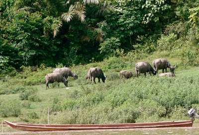 Once we settled into our floor seats, off we went. The trip was so beautiful, wild and raw that I still cannot believe I had such an amazing experience. 3 hours of traveling down this giant river lined with thick jungle. The only natural animals I saw on shore were water buffalo. However, from the bus widow I spotted many monkeys and a giant hornbill bird. We finally arrived to unload at a floating restaurant. From there we hiked up a steep hill with our luggage and waited for our driver to take us to Travellors Home.
