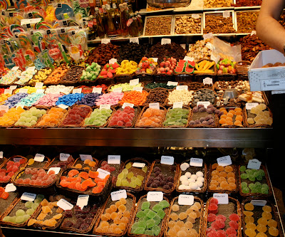 | Peter in front of the gummy candy stall at the mercat (market) |