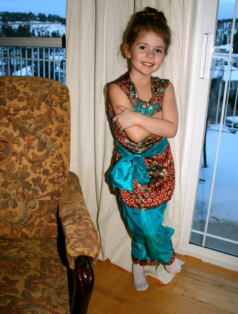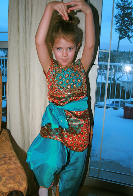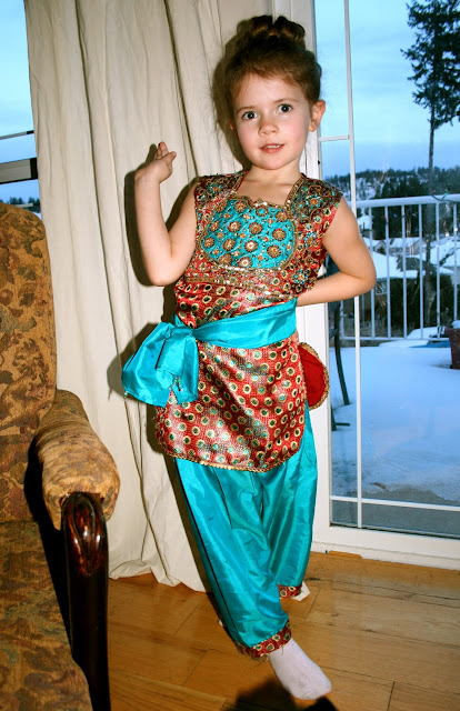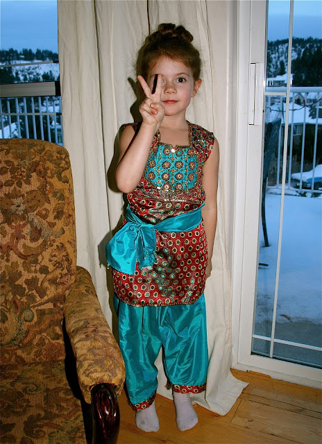 | Pippi before attending a birthday party for a friend last evening. She’s wearing an Indian outfit I purchased for her in Little India, Penang, Malaysia. |