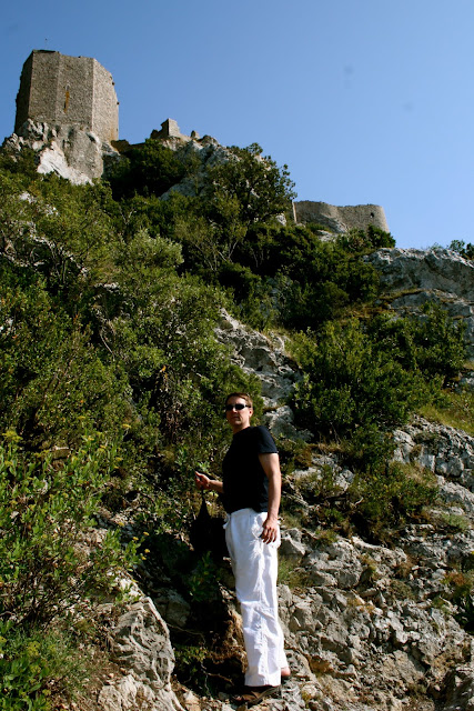 The Cathare Castles are from the tenth-eleven Century. They were refuge for a Christian religious group that did not follow Catholicism–the Cathares or Albigense. The Pope (Innocent III) viewed them as the greatest threat to the church and in 1208, he began Europe’s greatest army against them–the Crusades. [The Cathares were vegetarian, abstained from carnal pleasures, practiced total indeference to material possessions and believed in reincarnation ( a little bit Buddhist if you ask me)]. The last known Cathare was burned alive in 1321.