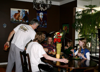 Breakfast for the children with Piper (the cockatiel) behind.