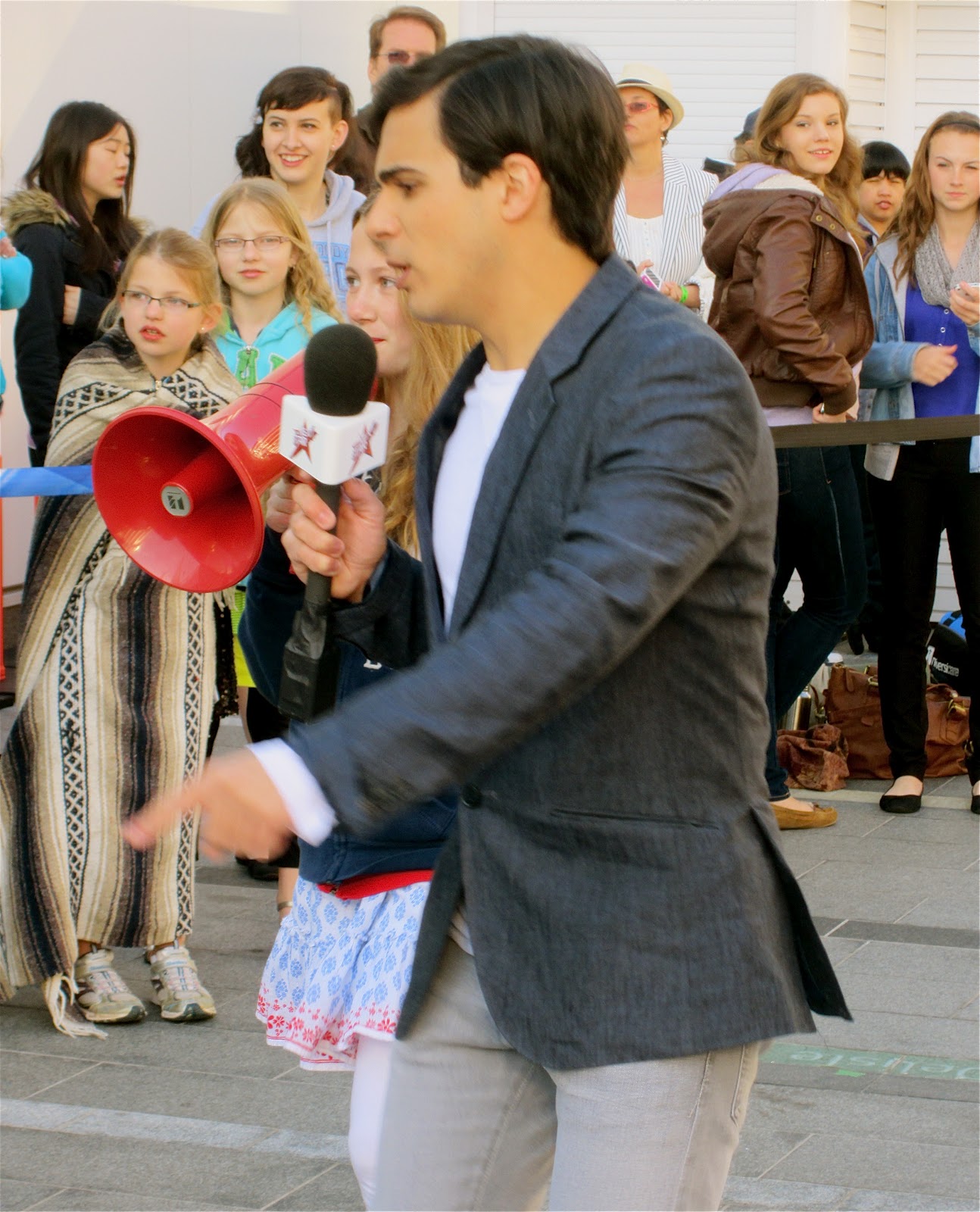 The morning started out well, at about 9 a.m., the host Adamo and film crew of The Next Star arrived. After strutting around filming this and that and interviewing the odd contestant in the line-up, they approached Pip and Tabs. Tabs was asked to accompany Adamo out of line and parade around with him for the cameras. She was given a megaphone and asked to scream “That’s a HAZARD!” every time they passed anything remotely in the way of their path. She had a great time and really belted out her lines. One of the producers said to me, “she is so adorable!”