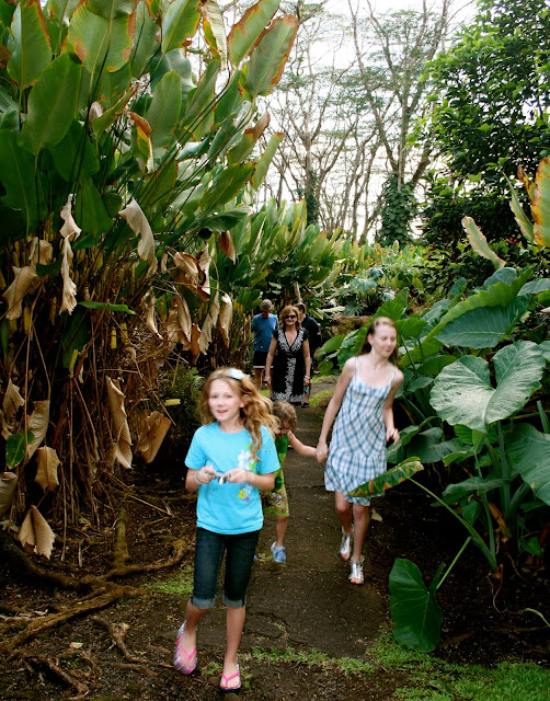 What a day! We drove to the other side of the Island. First we stopped in at Morning Fire Ranch to collect T and family. I love Morning Fire. The little ranch house is so Hawaiian. And the giant avocado tree in the yard is most impressive with avocados the size of giant grapefruits. The ranch lands up near Waimea are incredible! Rolling green hills, cacti, and lush forest. We drove onward through lush costal rainforests to Hilo where, we stopped at an amazing market for fruit (local papaya and bananas), tropical flowers [stunning tropical baskets (worth about $100+ in Canada) for only $5]and silk patchwork skirts! Hilo is a Hawaiian surf town, complete with slightly wind beaten wooden building and porches. We picnicked at the ocean on T’s fab sandwiches.