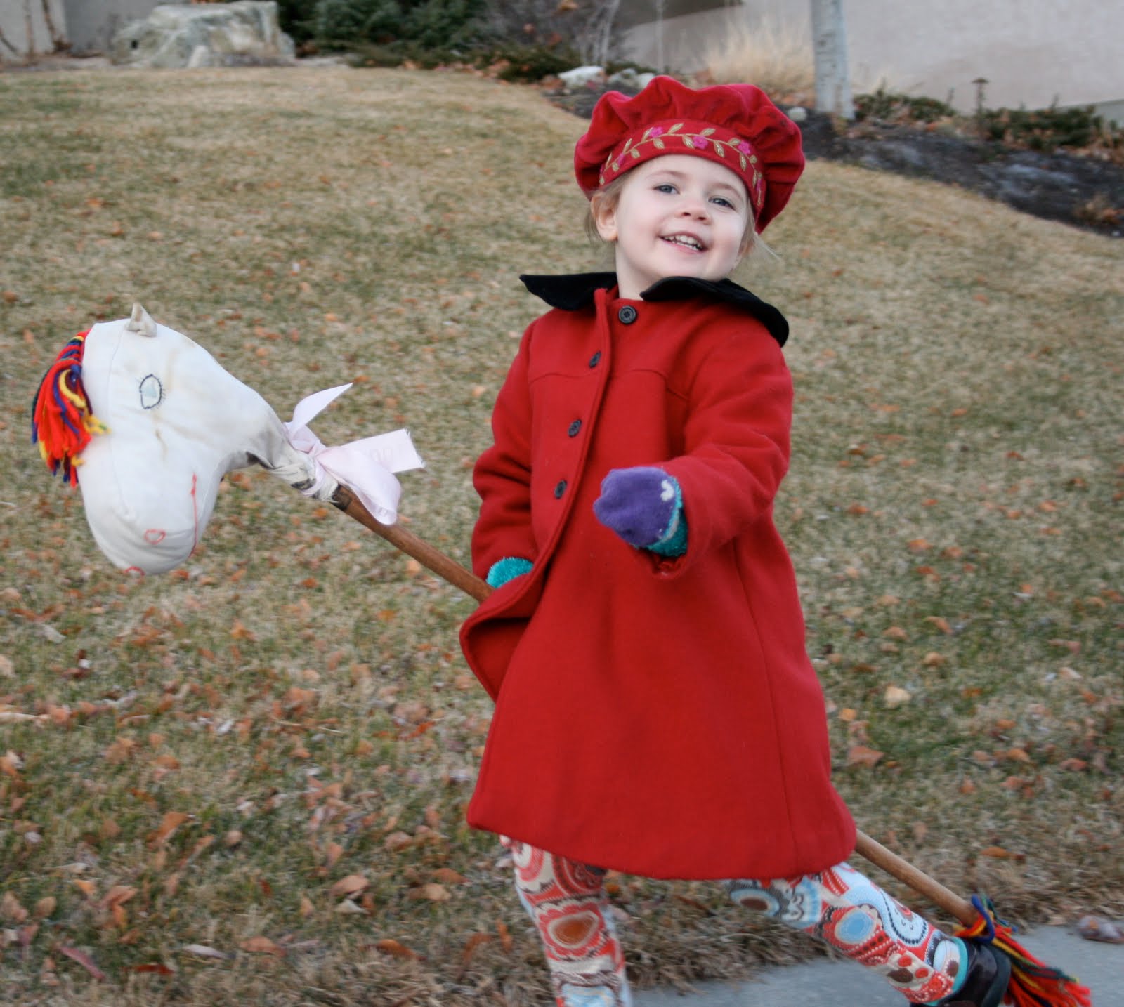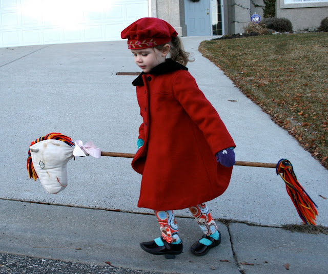 Pippi on her way to preschool this morning. She loves to ride Odo whose “real” name is Buddy according to Pip. Odo was made by my mom for my sister Miranda when she was about Pip’s age. I told Pip to make Odo gallop or we’d be late for school. She said, “I tired mom. That why him not gallop.” She also said, “Odo a lovely horse, isn’t him mom?” As you can probably understand, my little Pip is the dearest little sunshine and so precious I hate to leave her at preschool and miss any of her preciousness.