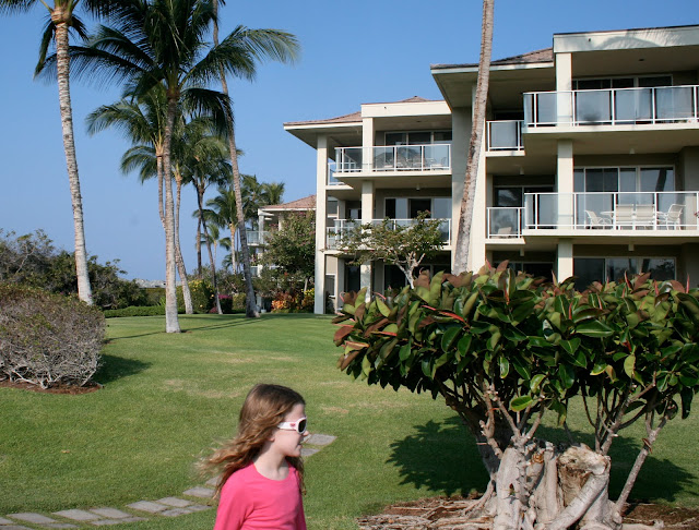 Due to popular demand, I am posting pics of our condo resort: Vista Waikoloa. Our condo is on the 1st level. We have 3 sets of patio doors leading to two decks that open to a golf course. The girls play ball on the lawn outside our patios all the time. The geckos visit each morning. The grounds are lovely, complete with wild turkeys and mongoose.