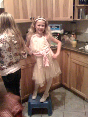 Pic is Tabs in one of her creations. I think this outfit was inspired by the wedding scene in “Mama Mia.”Just returned from the Tabs’ concert. Her class played the spoons to “Who Let the Frogs Out?” Very cute. Tabs was all smiles and moves.