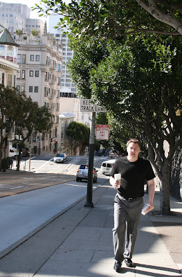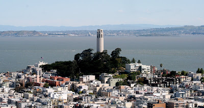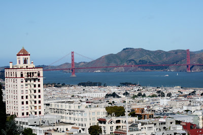 We’ve moved rooms. We left our giant suite in the older part of the Fairmont for this room in the new tower. The view from out our picture window is amazing. A view on the entire bay, from the Golden Gate to all the way over past Coit Tower and Telegraph Hill. Peter likes the view (we’re on the 20th floor best), I like the 11oo sq ft of the old suite! I’d like to go to Coit Tower and the original Mexican Mission before we leave.