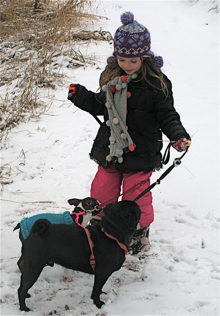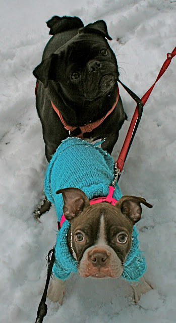 | Tabs and Pablo wearing a dog sweater knit by my mom for my very first pug Weldy (19 years ago!). |