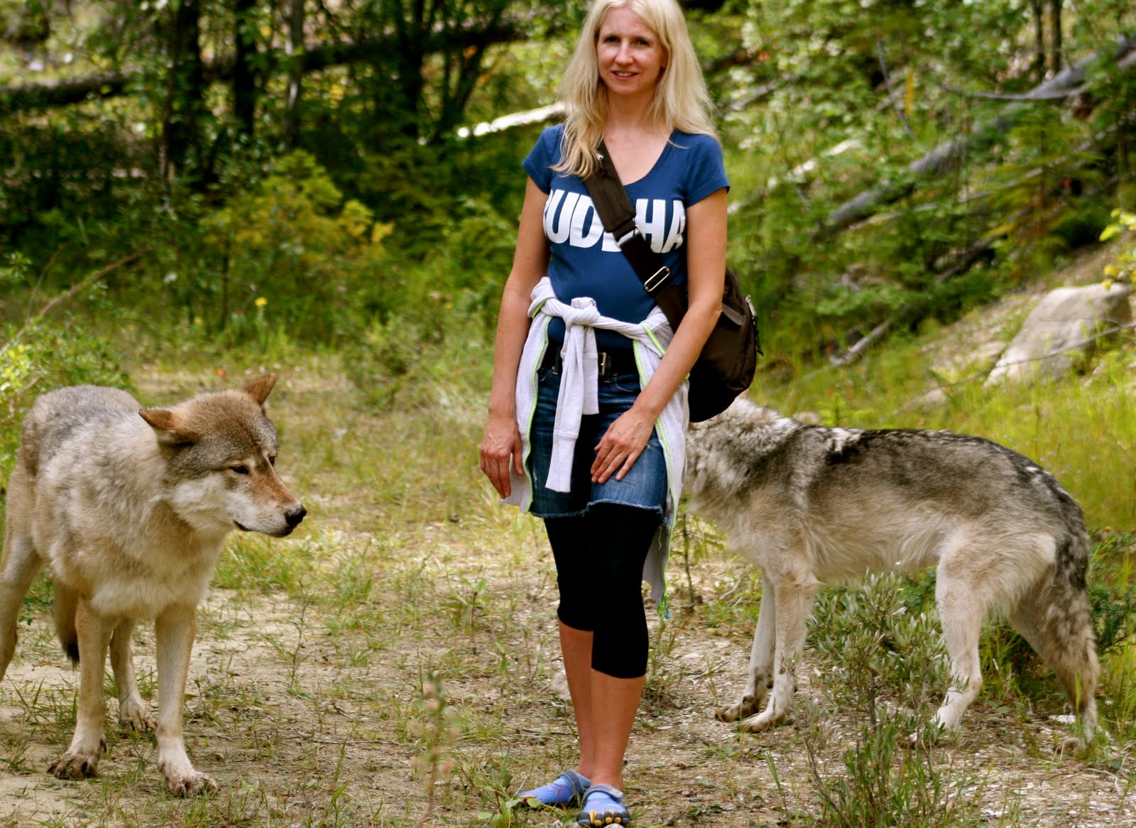 I will stick to our second stop, just west of Golden, BC–The Northern Lights Wolf Centre. I had booked myself in to hike in the mountain wilderness (crown land) with two wolves and their two handlers. I lucked out–I was the sole hiker signed up for Saturday afternoon. It was an amazing trip. We hiked with a large male and a smaller female grey wolf.