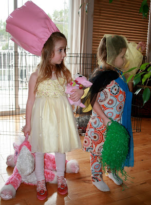 Pip and Artemis and their many uses of a faux leather, pink cowgirl skirt! I made the skirt for Tabitha and a matching one for Mistaya years ago. Tabs was only two. She knew a thing or two about fashion though. I brought her the finished skirt and asked her if she liked it. She held it up to her face looked down the waistband and yelled, “Hello down there!” She was bang on! The skirt resided in the dress-up trunk from that day forward until the twosome above unearthed it as a new fancy “crown.”
